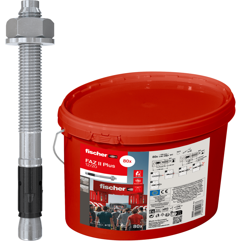 Der fischer Bolzenanker FAZ II Plus ist der Stahlanker für höchste Ansprüche mit hohen Quertragfähigkeiten und breitem Anwendungsfeld. Mit dem Stahlanker werden schwere Lasten in gerissenem Beton befestigt. Der FAZ II Plus kann durch Wegfall der Bohrlochreinigung einfacher und schneller gesetzt werden (M8-M24). Der bewährte Spreizclip leitet die Lasten sicher in den Beton ein und ermöglicht eine sofort belastbare, hohe Tragfähigkeit auch bei dynamischen Anwendungen. Ideal ist der Stahlanker beispielsweise für die Verankerung von Geländern, Kabeltrassen, Konsolen und bei dynamischen Belastungen wie Hebebühnen, Förderbändern und Pumpen.