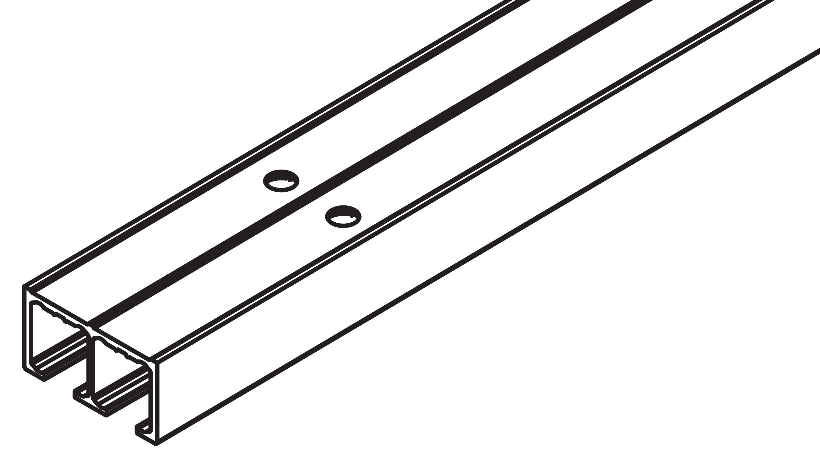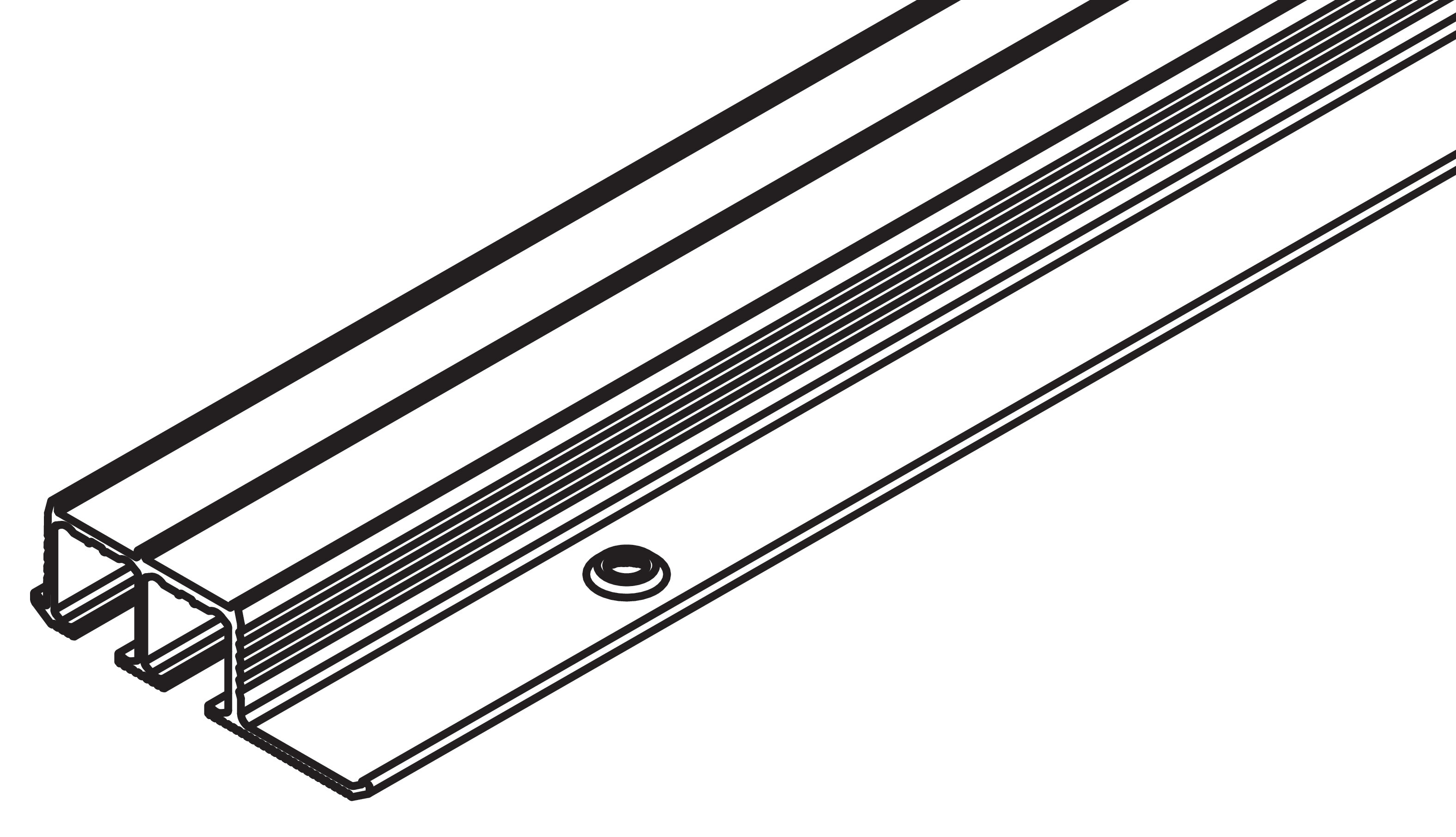 Beschlag für 2 oben laufende Glastüren bis 16 kg, mit aufgeschraubter oder eingenuteter Laufschiene. Mit Dämpfeinzug. Design Inslide.
