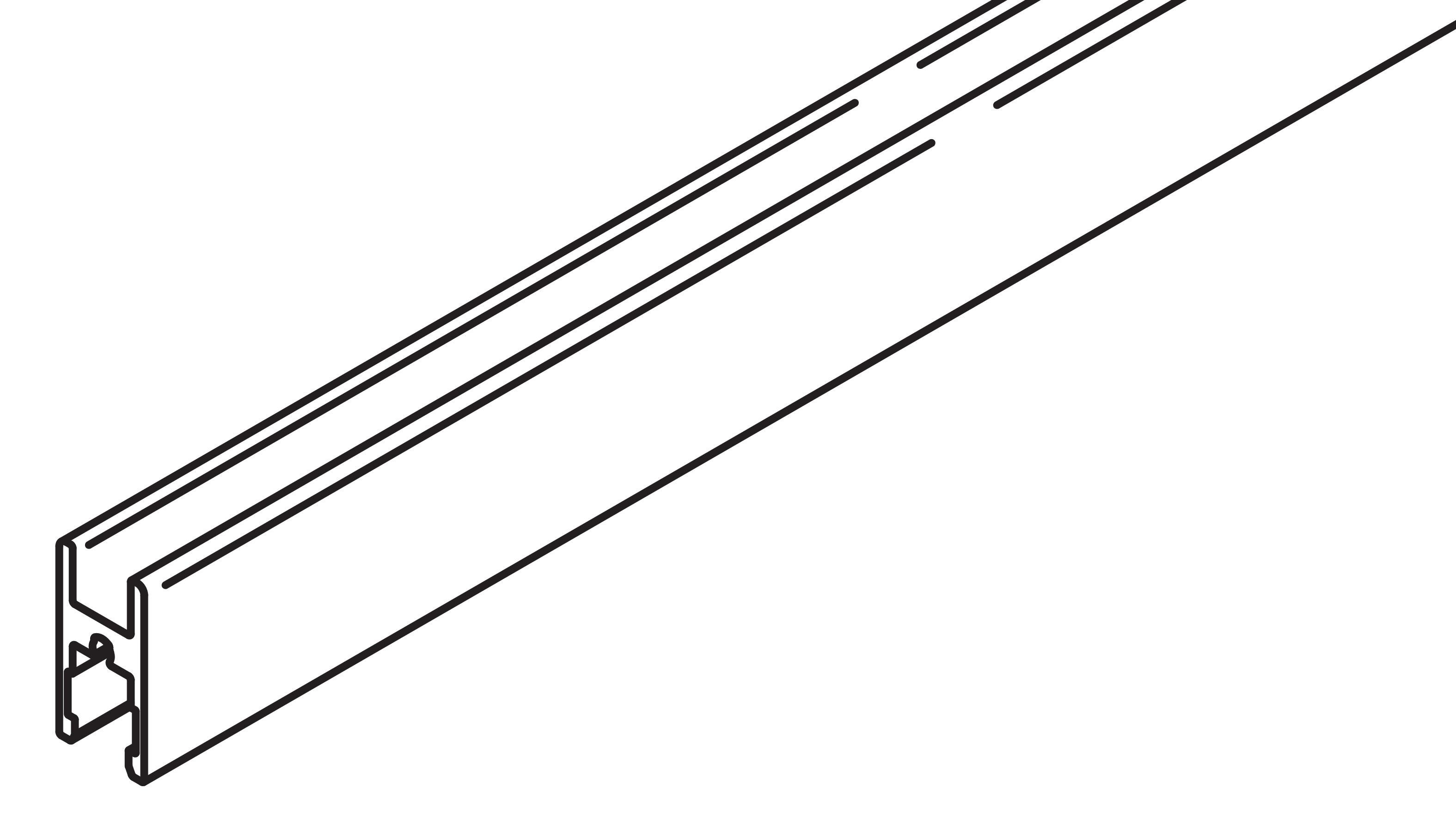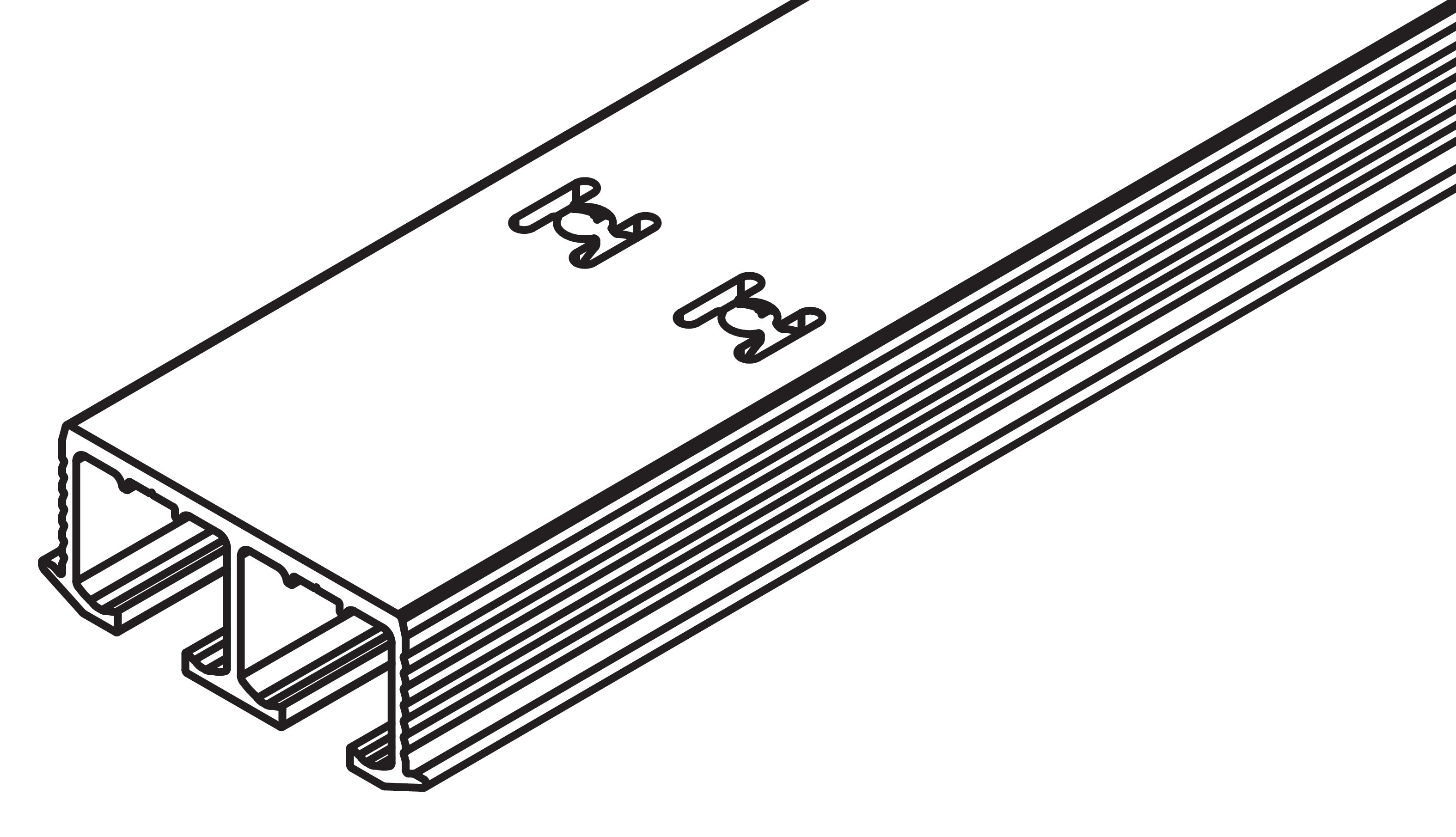 Beschlag für 2 oben laufende Glastüren bis 36 kg, mit aufgeschraubter oder eingenuteter Laufschiene. Mit Dämpfeinzug. Design Inslide.