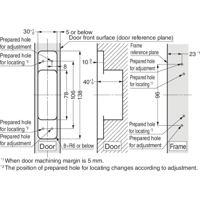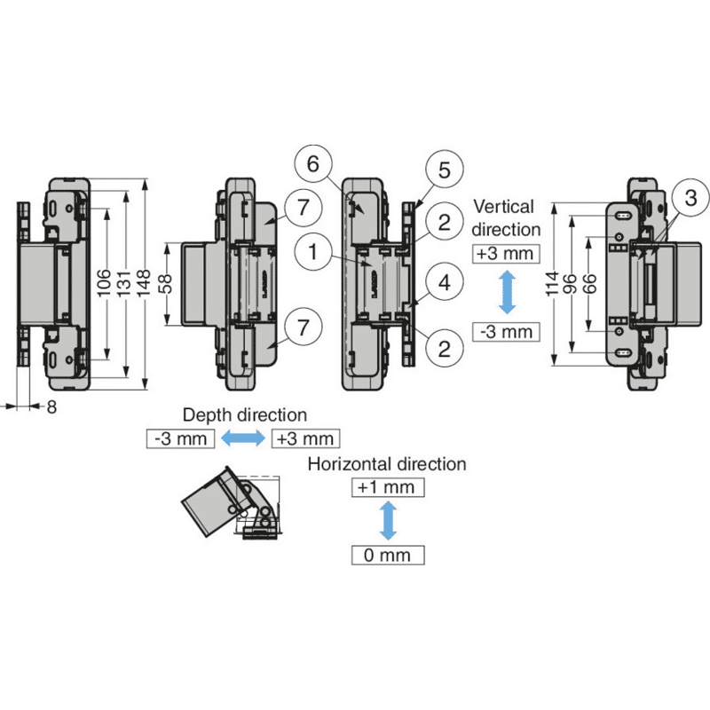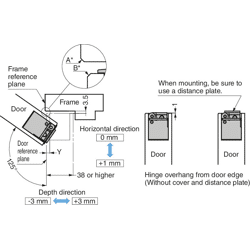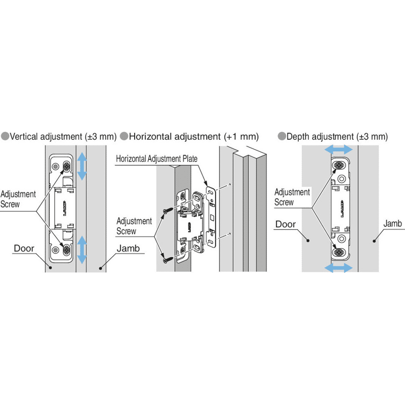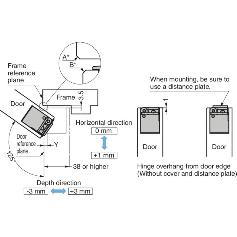 Die Oberflächenmontage für den Türrahmen ermöglicht eine einfache Montage. Die 3-D-Verstellung erlaubt eine Seiten-, Höhen- und Tiefenverstellung der Tür nach dem Einbau. Verwenden Sie einen Türstopper, um ein weiteres Öffnen über 125° hinaus zu verhindern. Das Scharnier kann nicht zwischen der Tür und dem Rahmen geteilt werden.